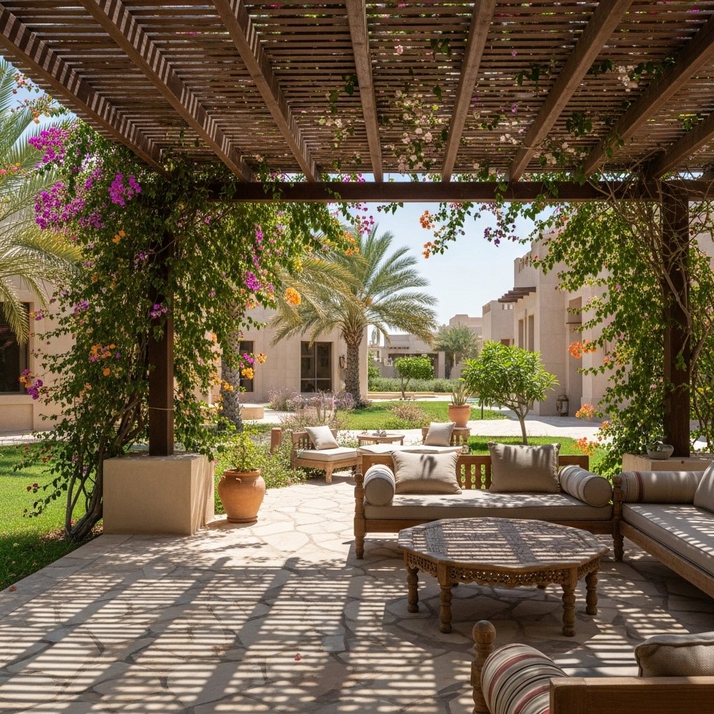 We designed a shaded pergola garden in Al Hail North featuring climbing plants, a sitting space, and energy-efficient garden lights.