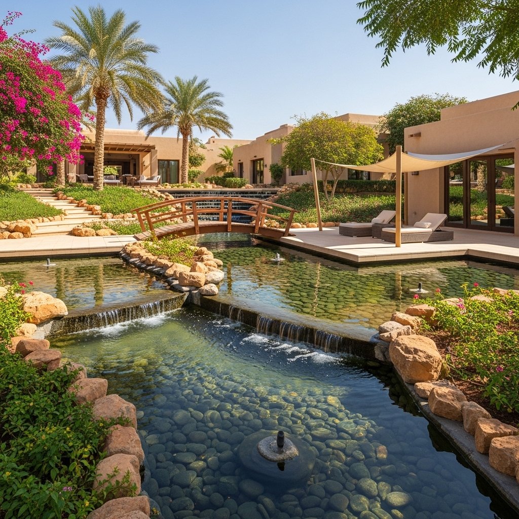 This garden in Al Ansab includes aromatic plants like lavender, rosemary, and gardenia, paired with stone paths for a sensory outdoor experience.