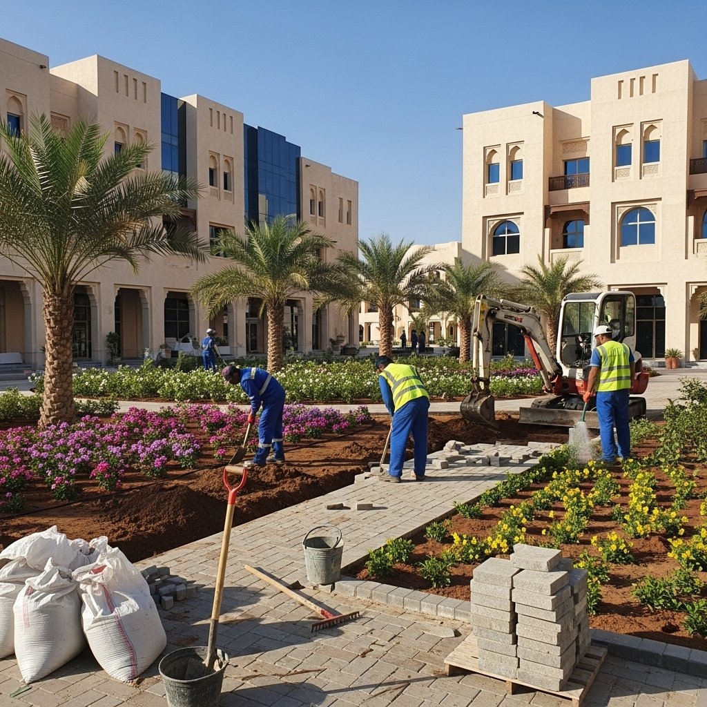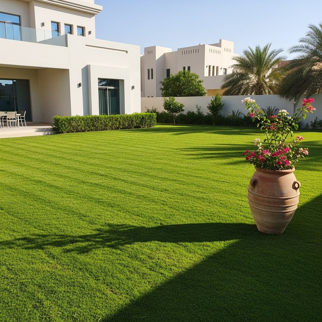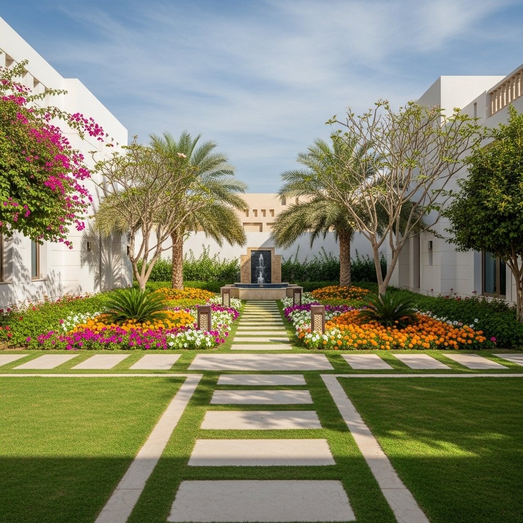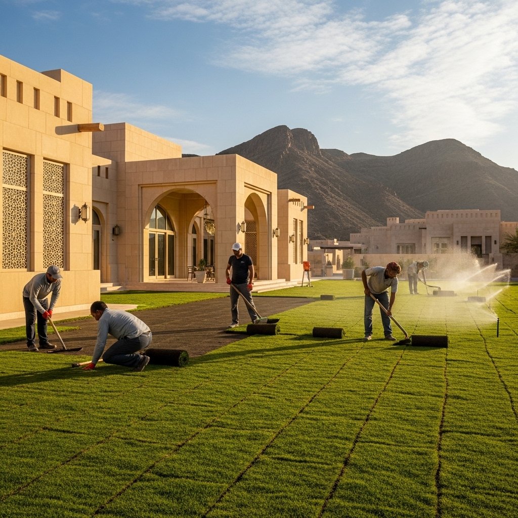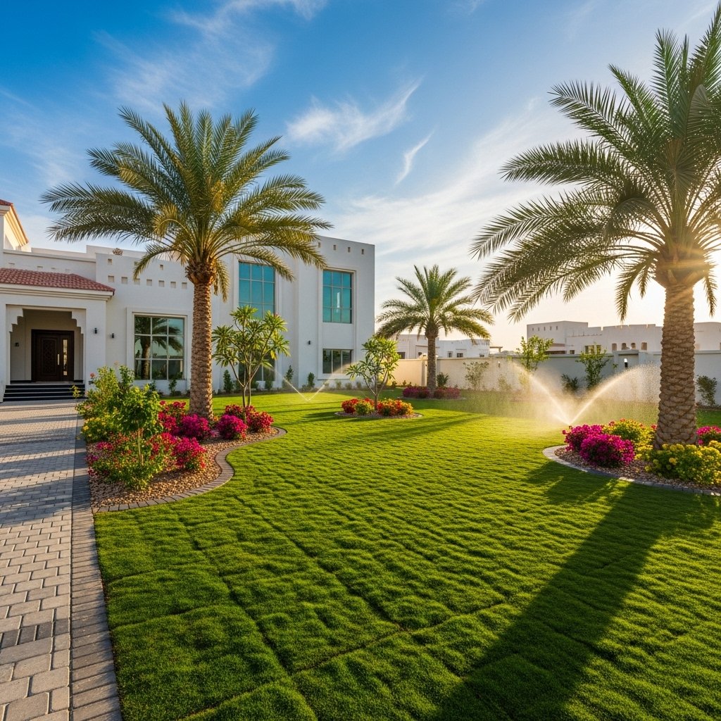 Residential Garden Landscaping Project in Muscat – Complete garden design with lawn installation, ornamental plants, and smart irrigation for a private villa in Muscat.