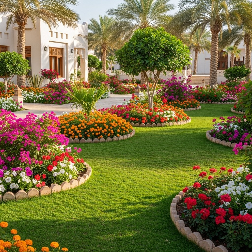 In Azaiba, we mixed bright flowers with natural green grass to create a colorful and relaxing garden design for everyday enjoyment.