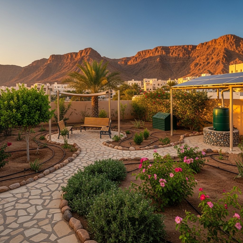 Outdoor Garden Design & Planting in Al Amerat – Sustainable garden project focused on drought-resistant plants and clean layout.