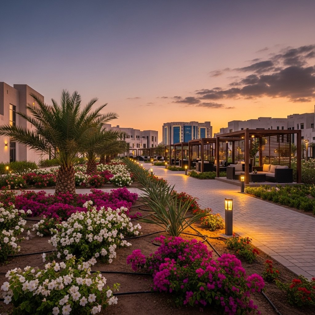 We created an eco-friendly garden in Al Khuwair South using organic soil, native plants, and a water-saving irrigation system to promote sustainable gardening