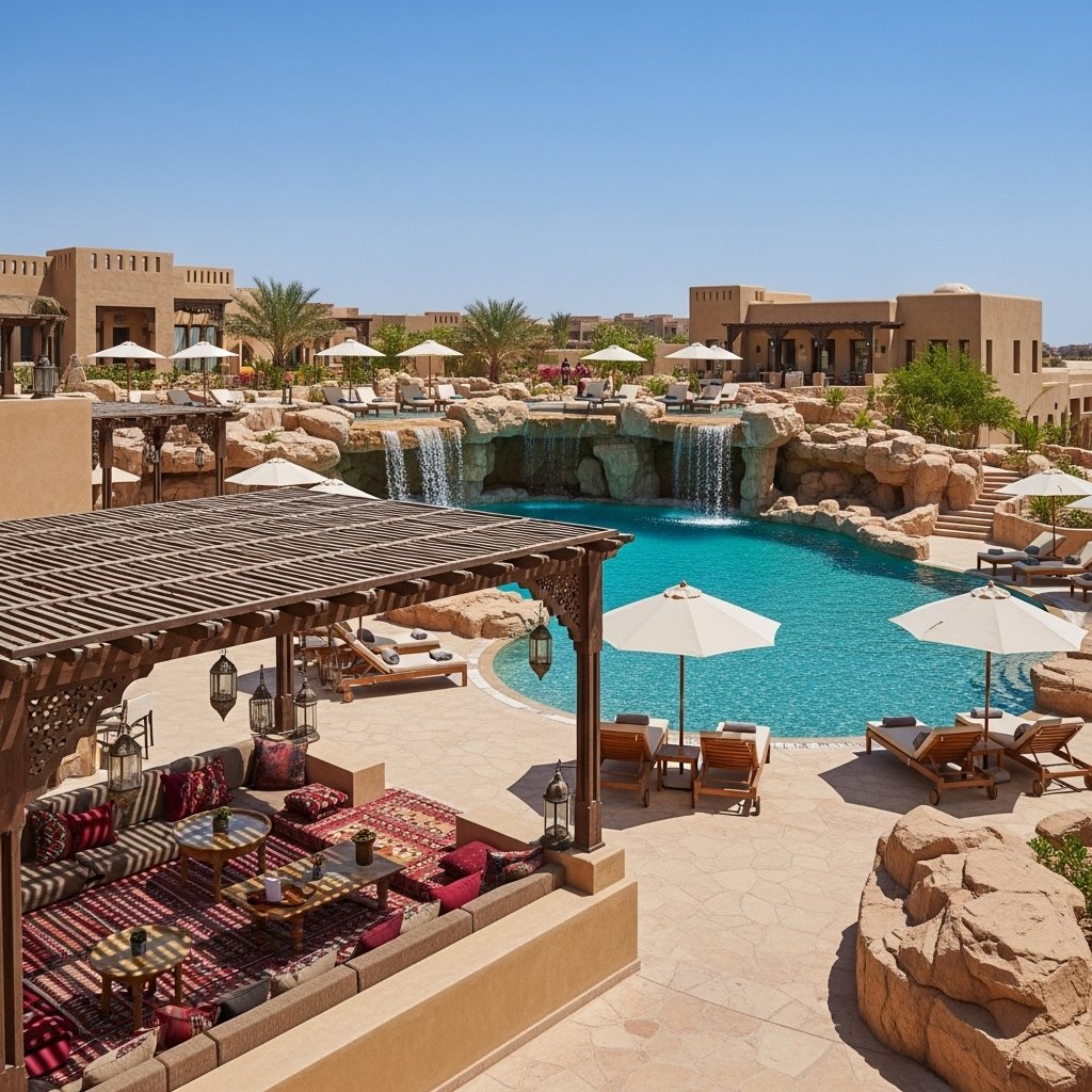 In Boshow, we created a garden inspired by Omani tradition with date palms, clay pots, and natural pathways for a cultural touch