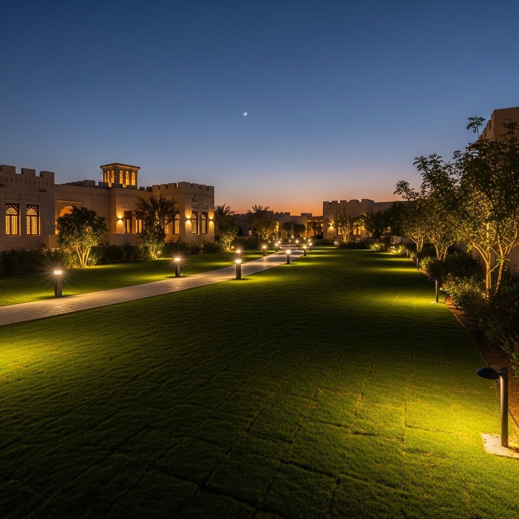 We installed low-voltage lighting in Al Ghubra to highlight pathways, accent trees, and create a magical nighttime garden ambiance.