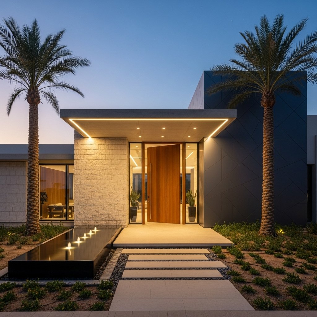 This project focused on improving the villa entrance with palm planting, flower borders, and modern outdoor lighting.