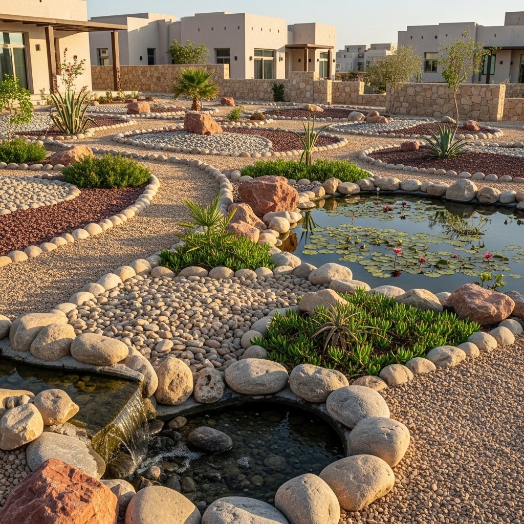In Al Koudh, we crafted a modern stone garden with patterned rock arrangements, ornamental grasses, and sculptural elements for a clean, artistic look.