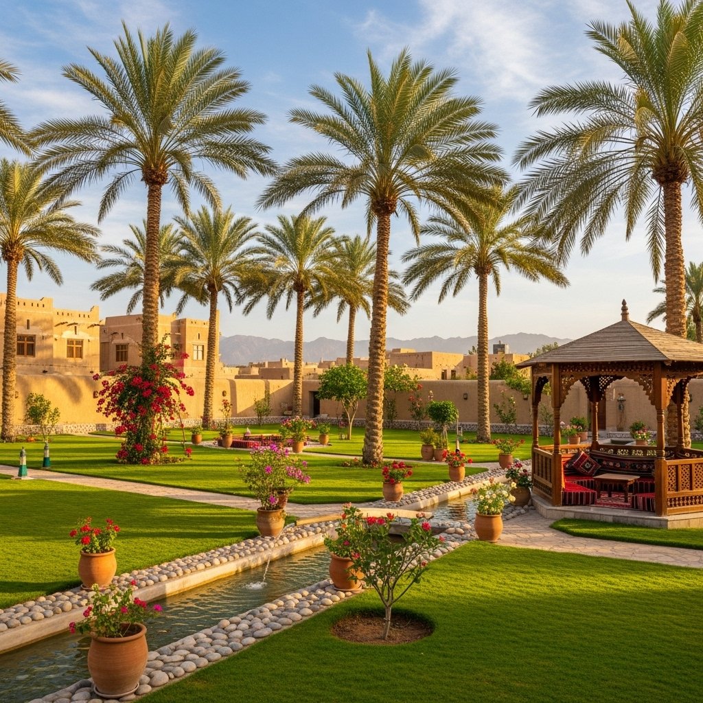 In Saham Village, we combined date palms with natural grass and local plants to create a traditional Omani-style garden.