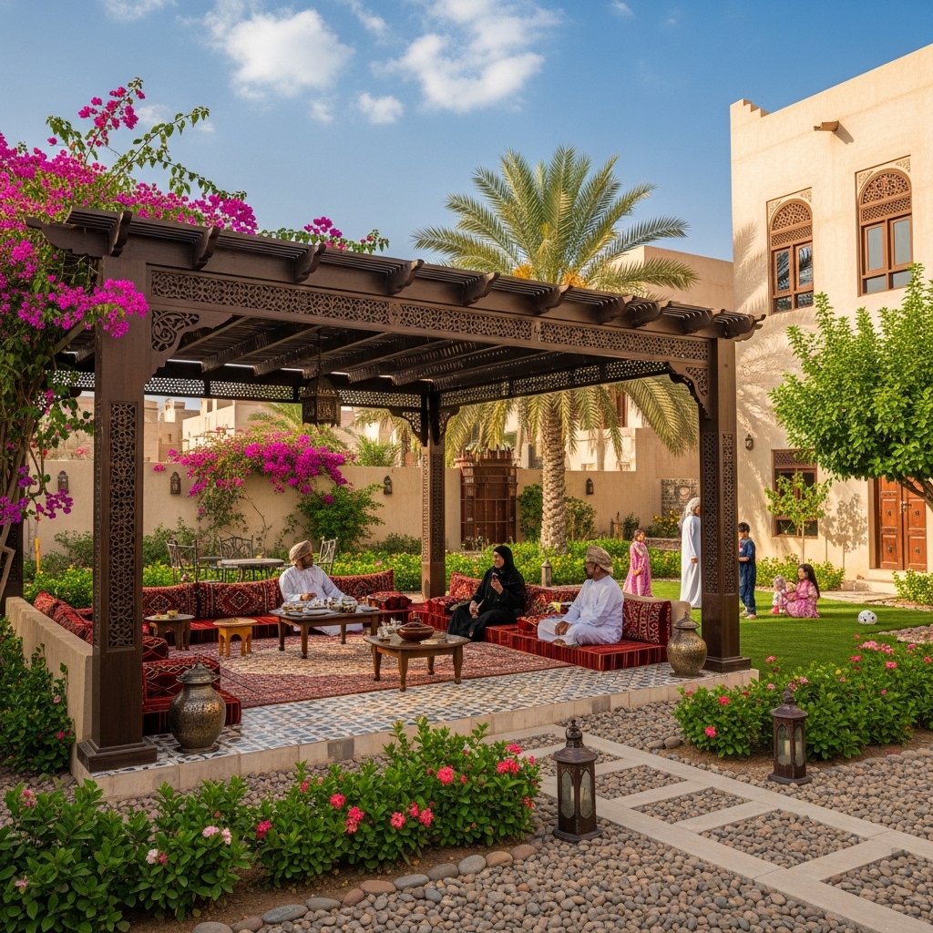 We restored a traditional-style courtyard in Boshow with date palms, shaded seating, and seasonal plants that reflect Omani culture.